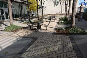 courtyardRenovation of the 9,500 square foot area includes removal of current non-native landscaping and replacement with native plantings that can withstand long periods of exposure to drought. A unique bladder and stormwater collection system is interconnected via underground aqueducts that maximize stormwater collection and the system’s infiltration properties. Micro-porous pavement system in the form of meandering paths are enhanced by rain barrels and cisterns located throughout the project area. We’ve even included a space for educational programming!