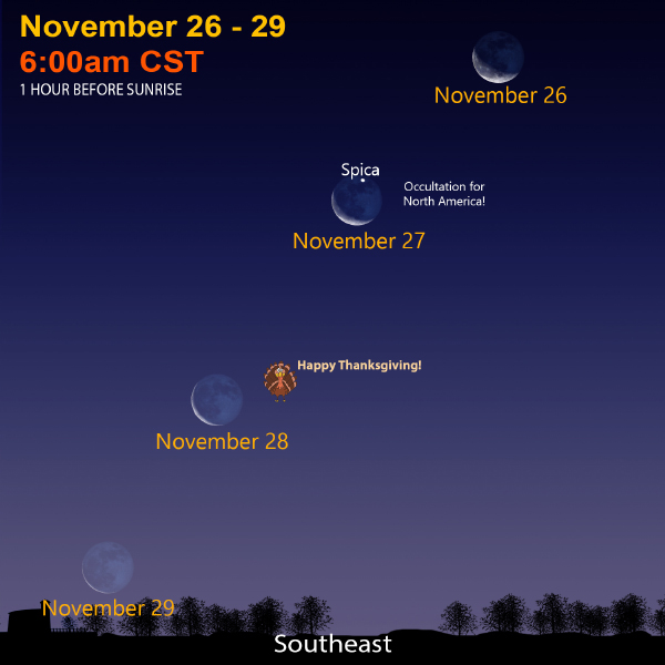 Thanksgiving night marks the return of brilliant Orion. Look for this winter constellation around 8 p.m. in the eastern sky. On November 27, the Moon will occult (eclipse) the bright star Spica.