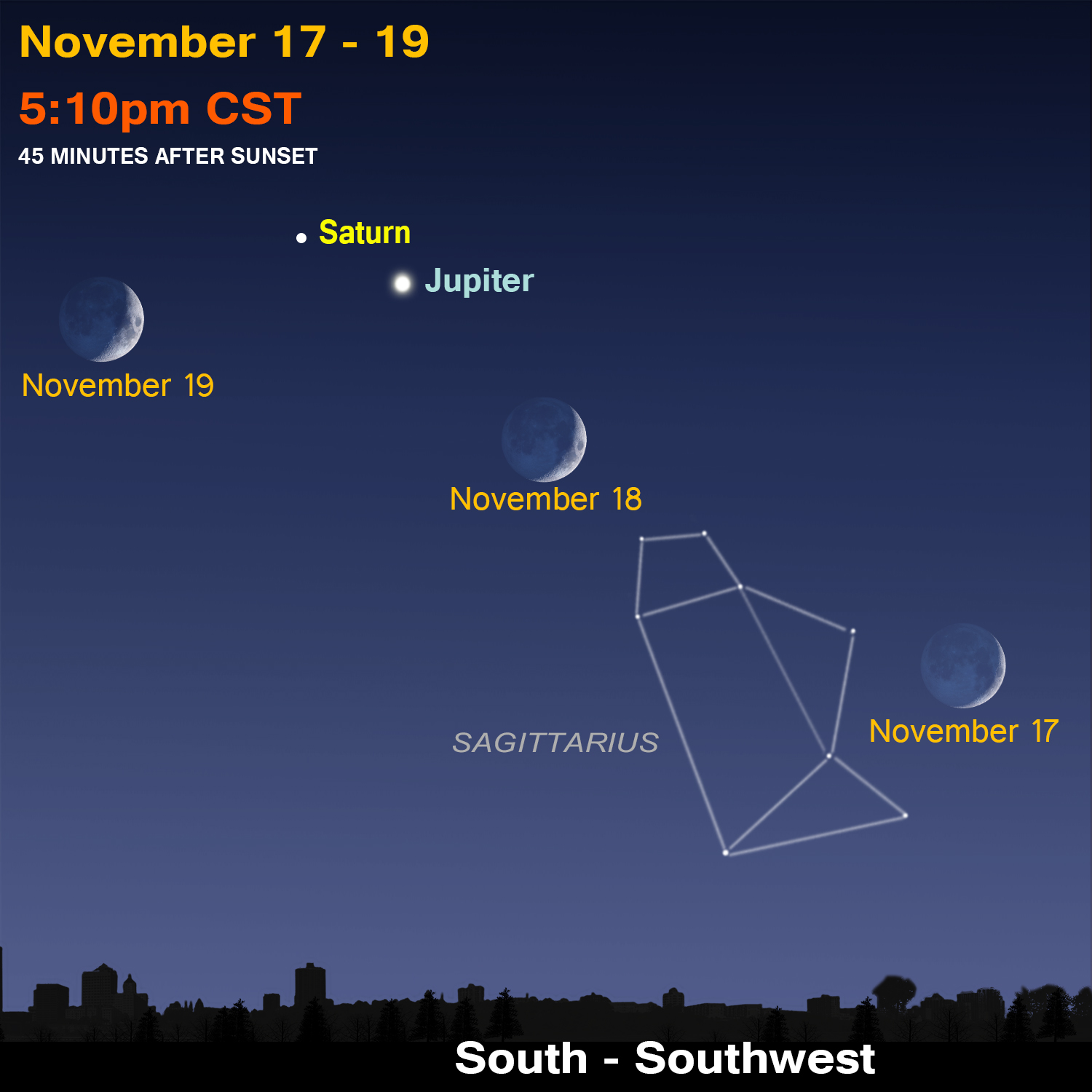 Jupiter and Saturn start November five degrees apart. By November 30, they will be 2.3 degrees apart—more than twice as close. You can measure this degree distance by using your finger. Hold one finger out in front of you. The width of your fingernail at arm’s length is about two degrees. The full moon is half a degree wide, so you can easily cover the moon with one finger.