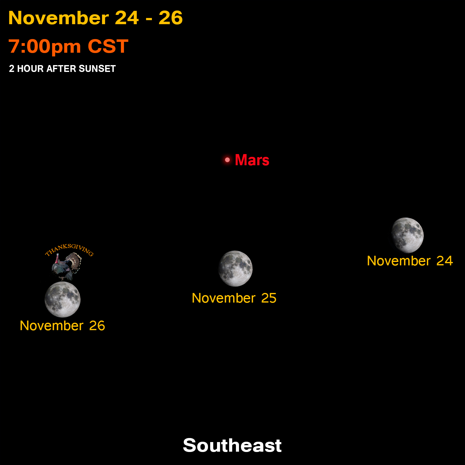 Mars is high in the southeast a few hours after sunset. At the start of the month, it rivals Jupiter in brightness. However, by November’s end, it dims significantly as its distance from Earth increases. Watch the Moon pass the red planet from November 24-26.