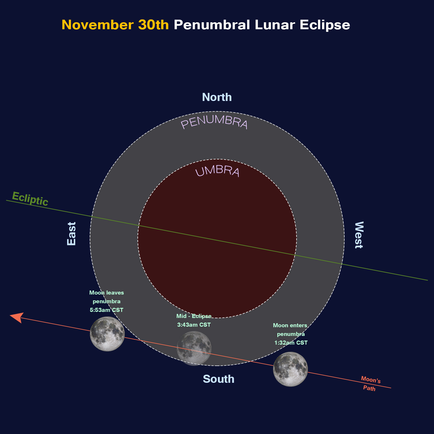 _0.jpg) There is a very faint penumbral lunar eclipse on Monday, November 30, but it’s in the middle of the night. If your cosmic curiosity rises—or you can’t sleep—the Moon will darken slightly. Our moon puts on a more spectacular show when it passes through the Earth’s much darker—and colorful—umbral shadow.