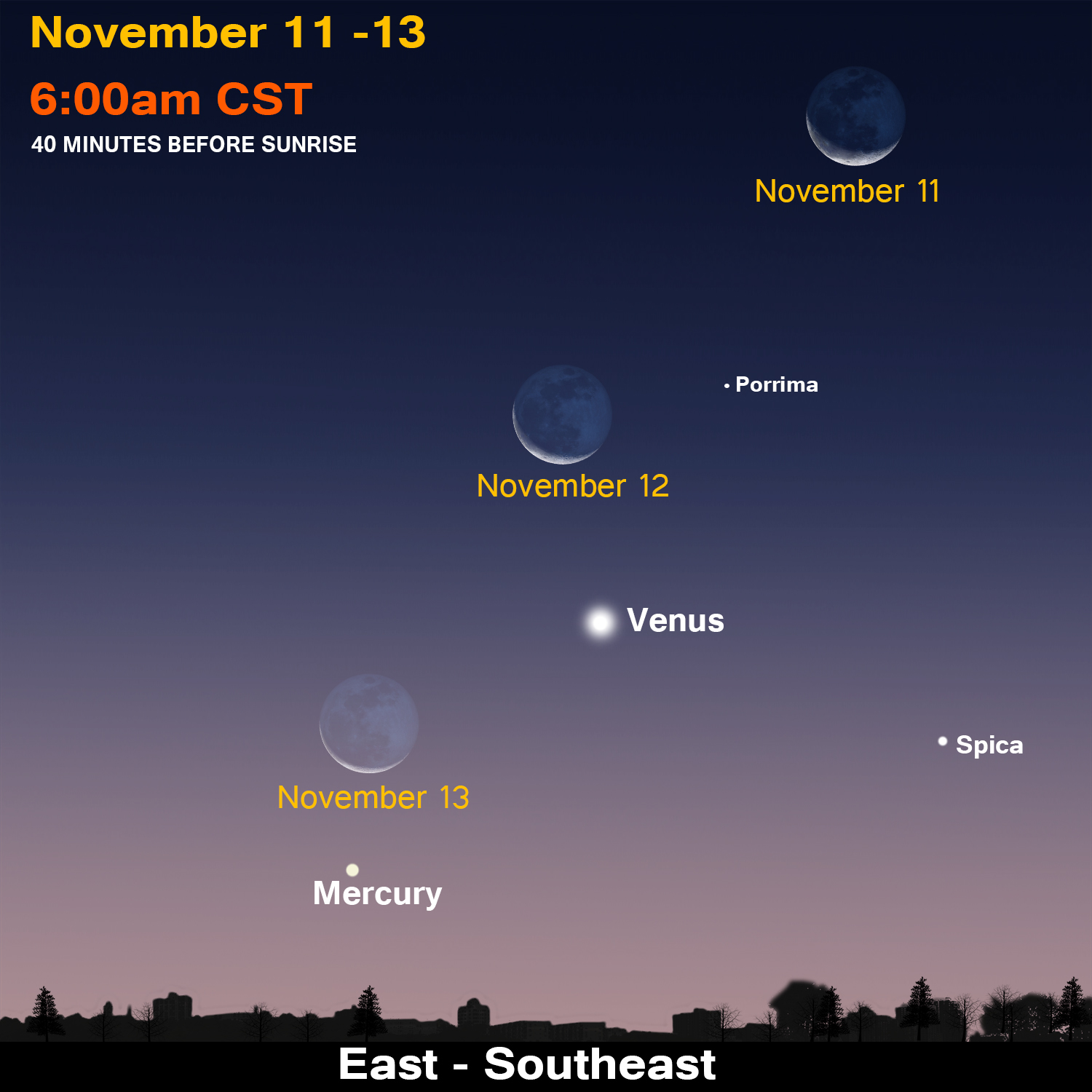 _0.jpg) Venus still dazzles in the dawn skies, but it is moving back toward the sun. The bright planet still rises about three hours before sunrise. The Moon joins Venus—and Mercury—from November 11-13. The smallest planet will be much more difficult to spot.