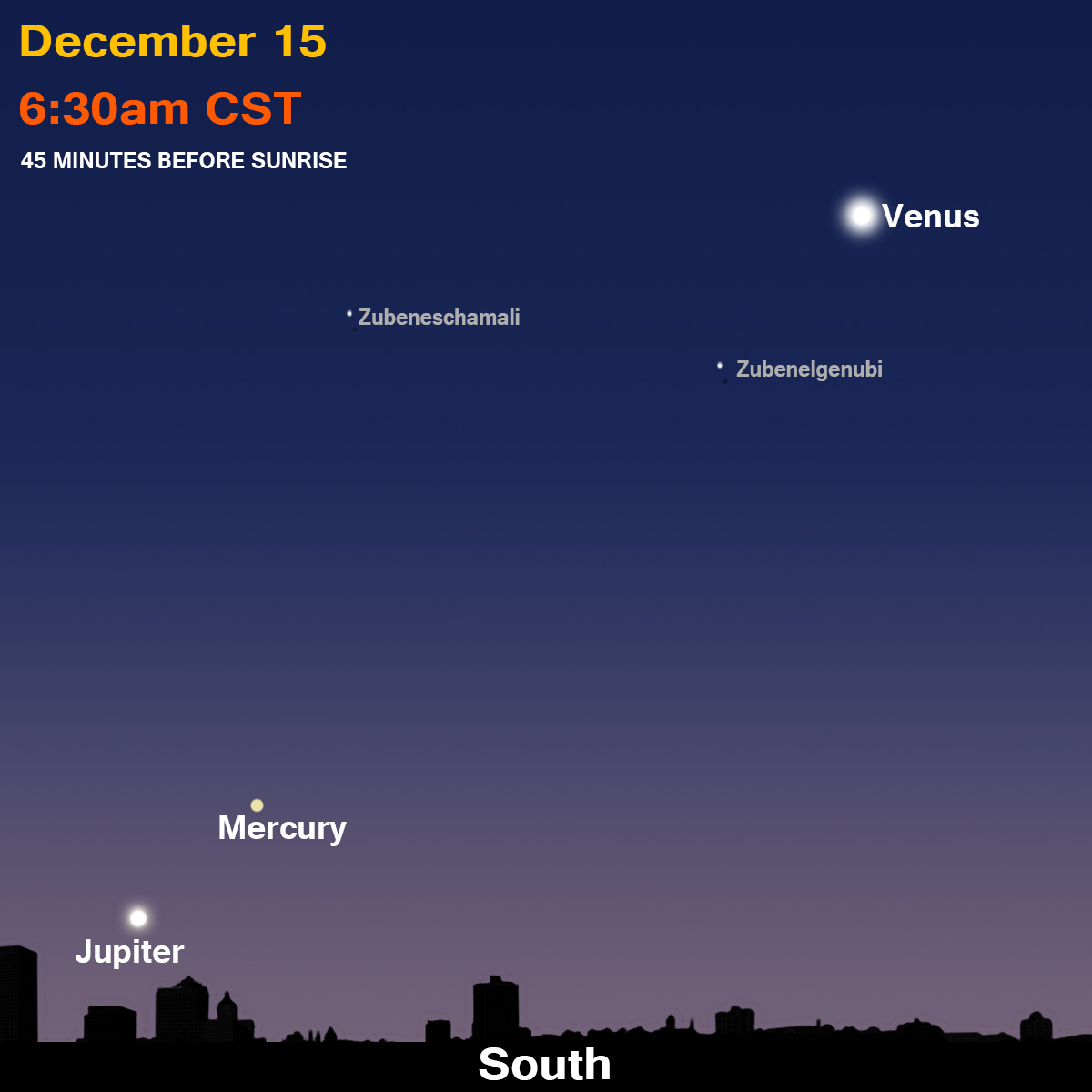 Jupiter and Mercury join Venus in the morning sky. Little Mercury is best seen around mid-December. Giant Jupiter gets better toward the end of the month. Watch the largest and smallest planet pass each other on a frosty morning from December 20-22. See the waning crescent Moon close in on Jupiter at December’s end and early January.