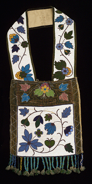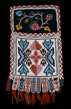 This beadwork panel has not been attached to a, but would be the main pouch design. It exhibits a large floral design with blue, green, yellow, orange, black, pink, and white beads.